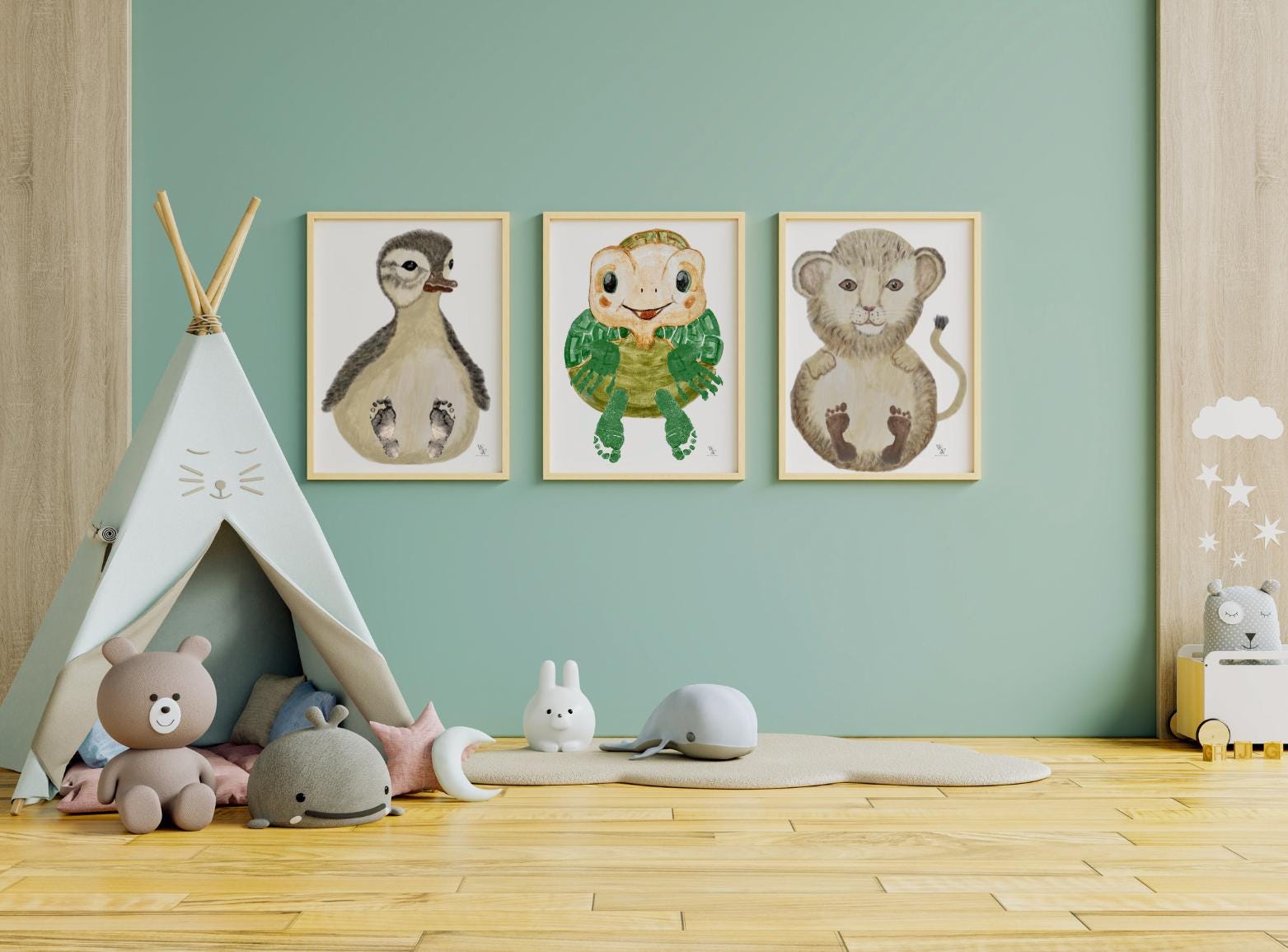 🎨 Hand-painted animal poster as a digital download – with space for baby footprints and handprints
