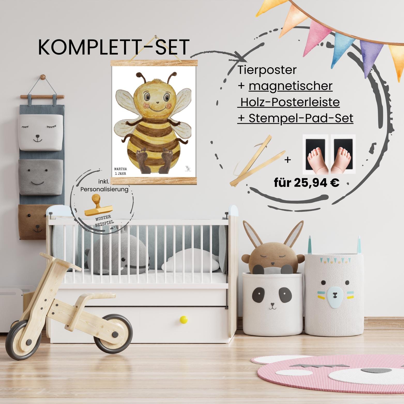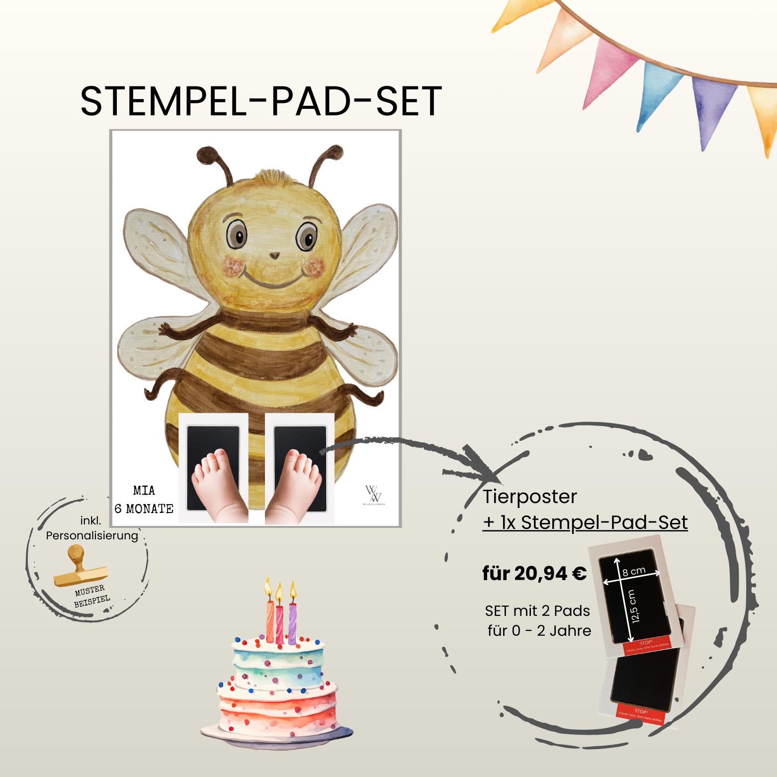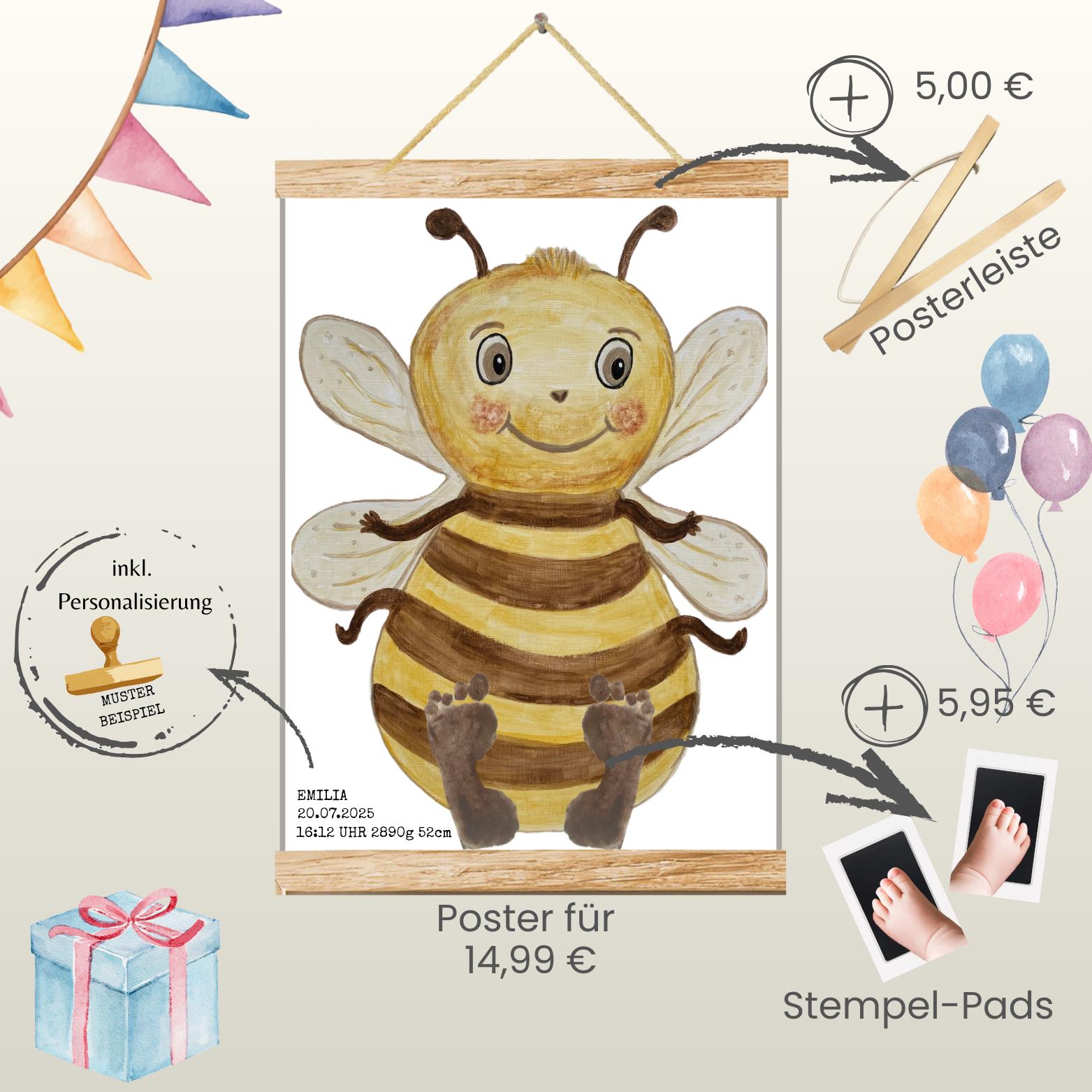 Bee | Hand-painted Animal Baby Poster | Footprint and Handprint Set | Personalized Gift for Birth or Christening | Baby Poster A3 | Clean Touch Pad