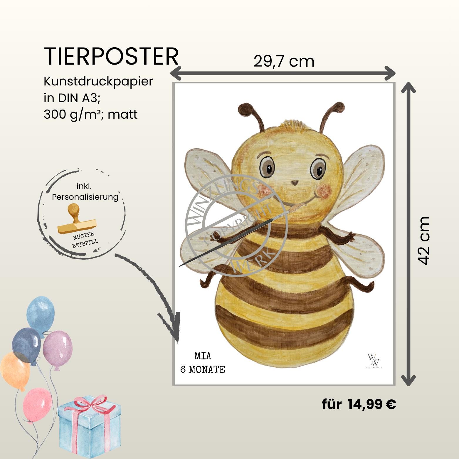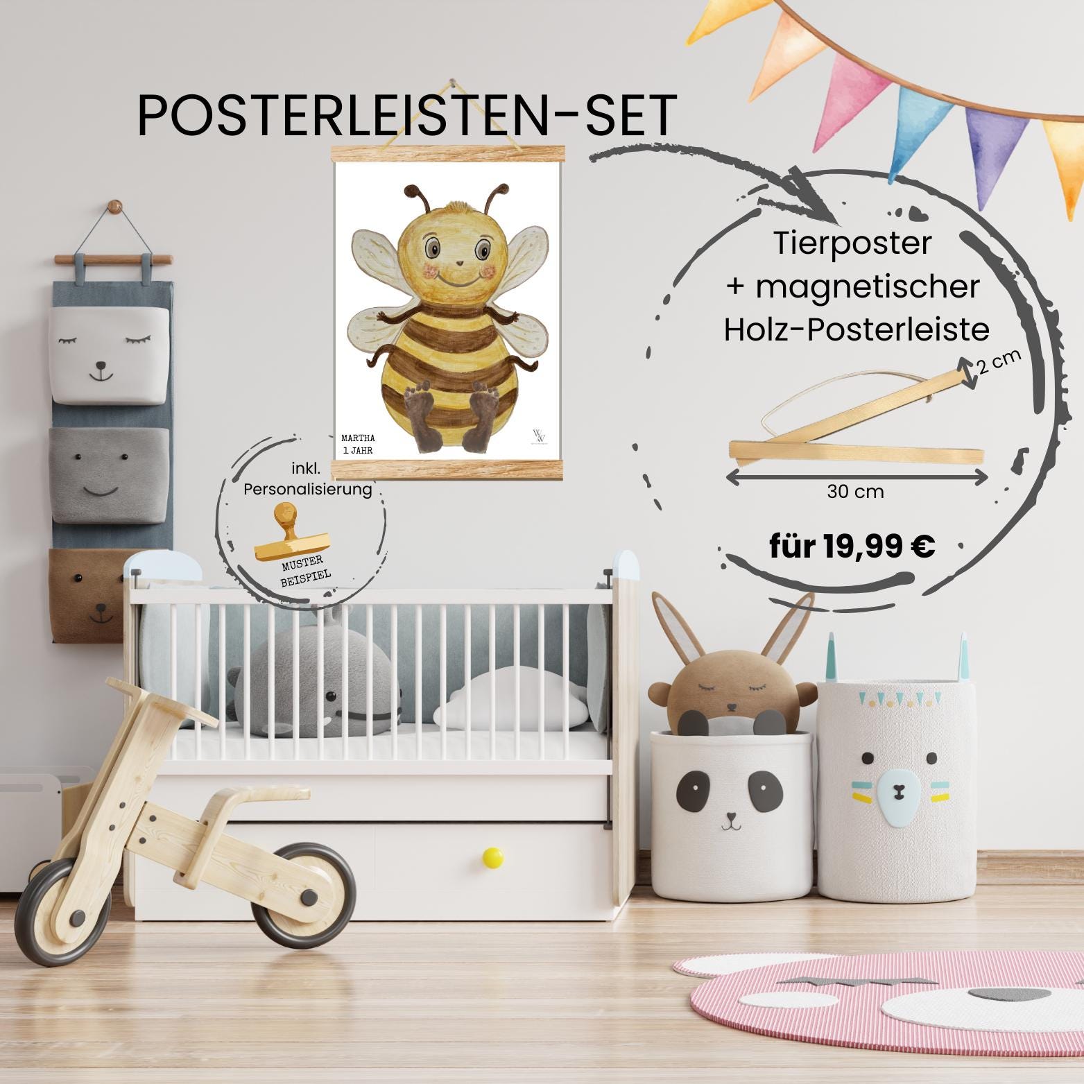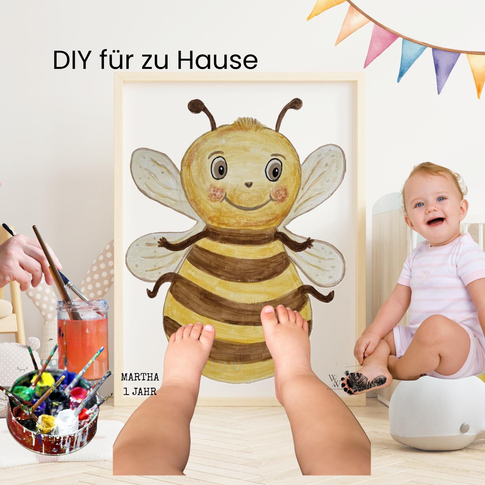Bee | Hand-painted Animal Baby Poster | Footprint and Handprint Set | Personalized Gift for Birth or Christening | Baby Poster A3 | Clean Touch Pad