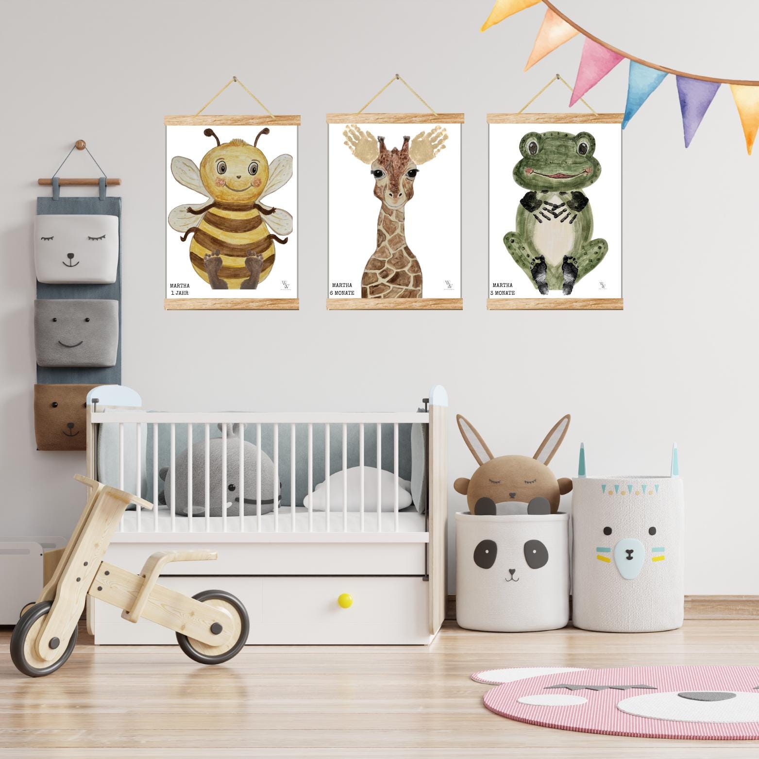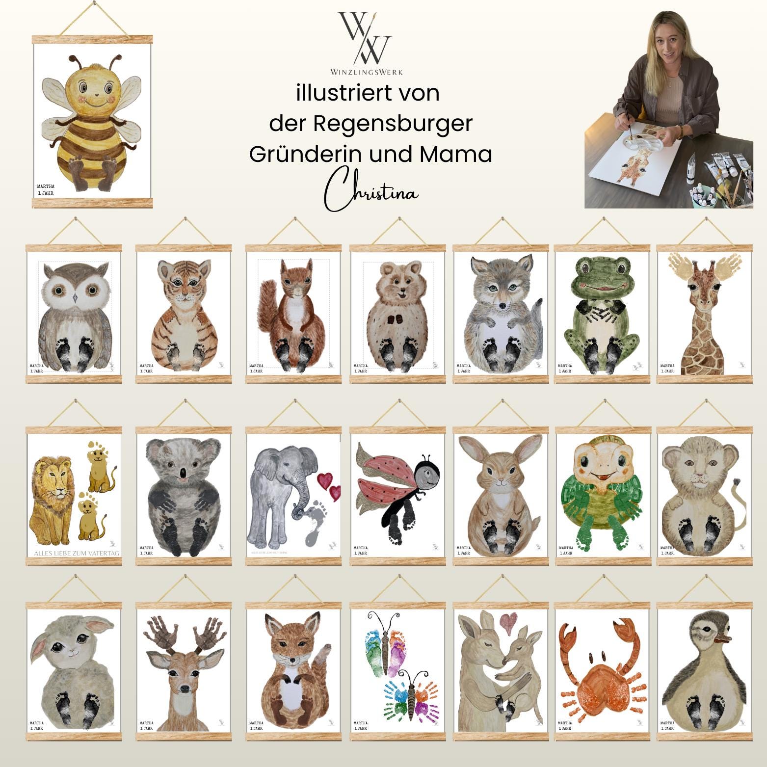 🎨 Hand-painted animal posters – unique baby foot & handprint set
