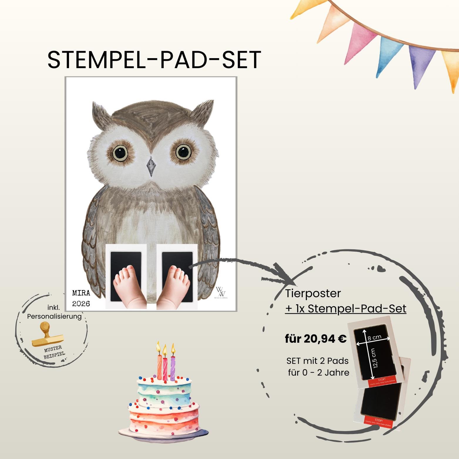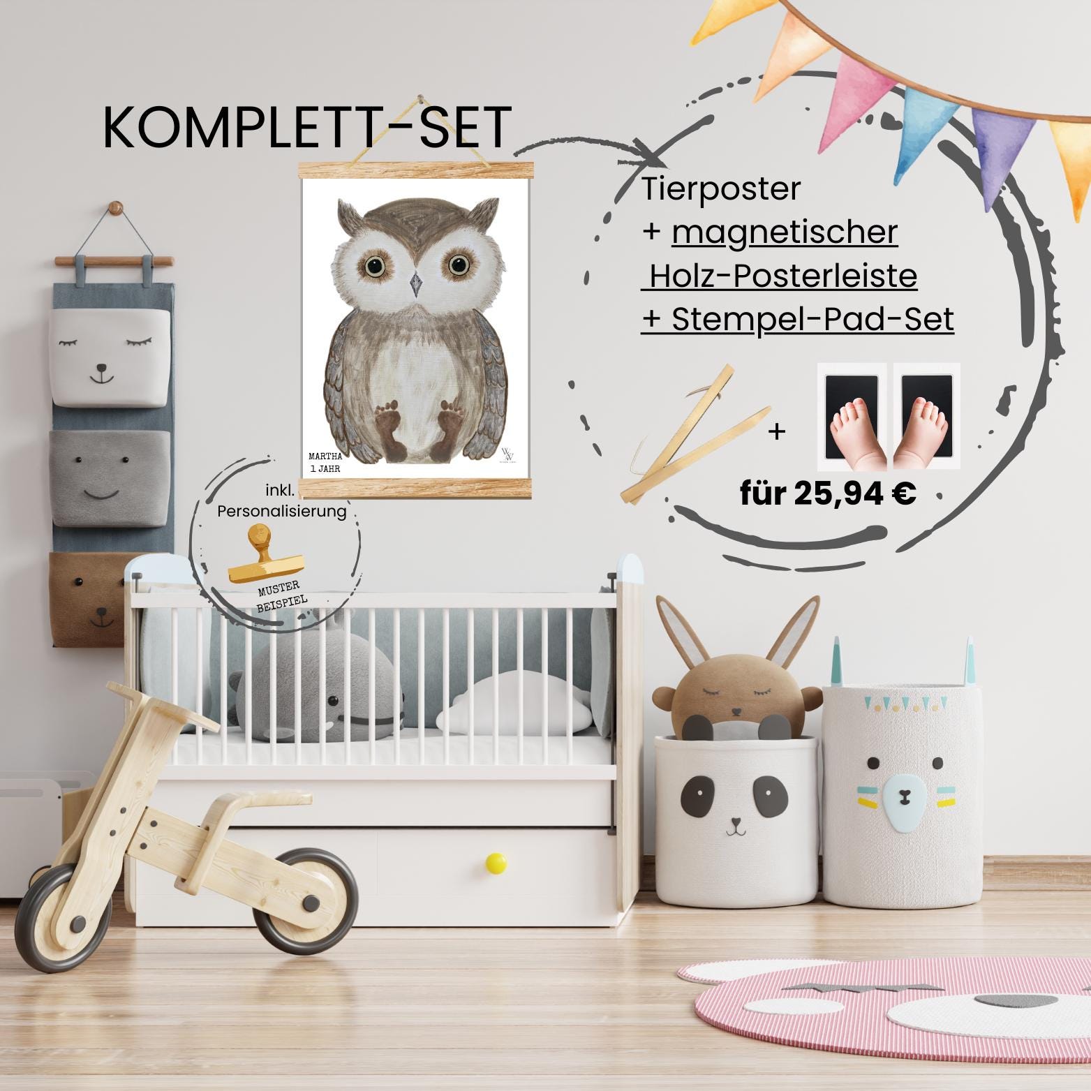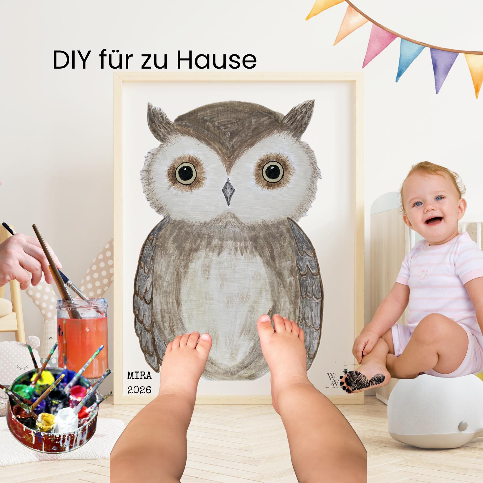 Owl | Hand-painted Animal Baby Poster | Footprint and Handprint Set | Personalized Gift for Birth or Christening | Baby Poster A3 | Clean Touch Pad