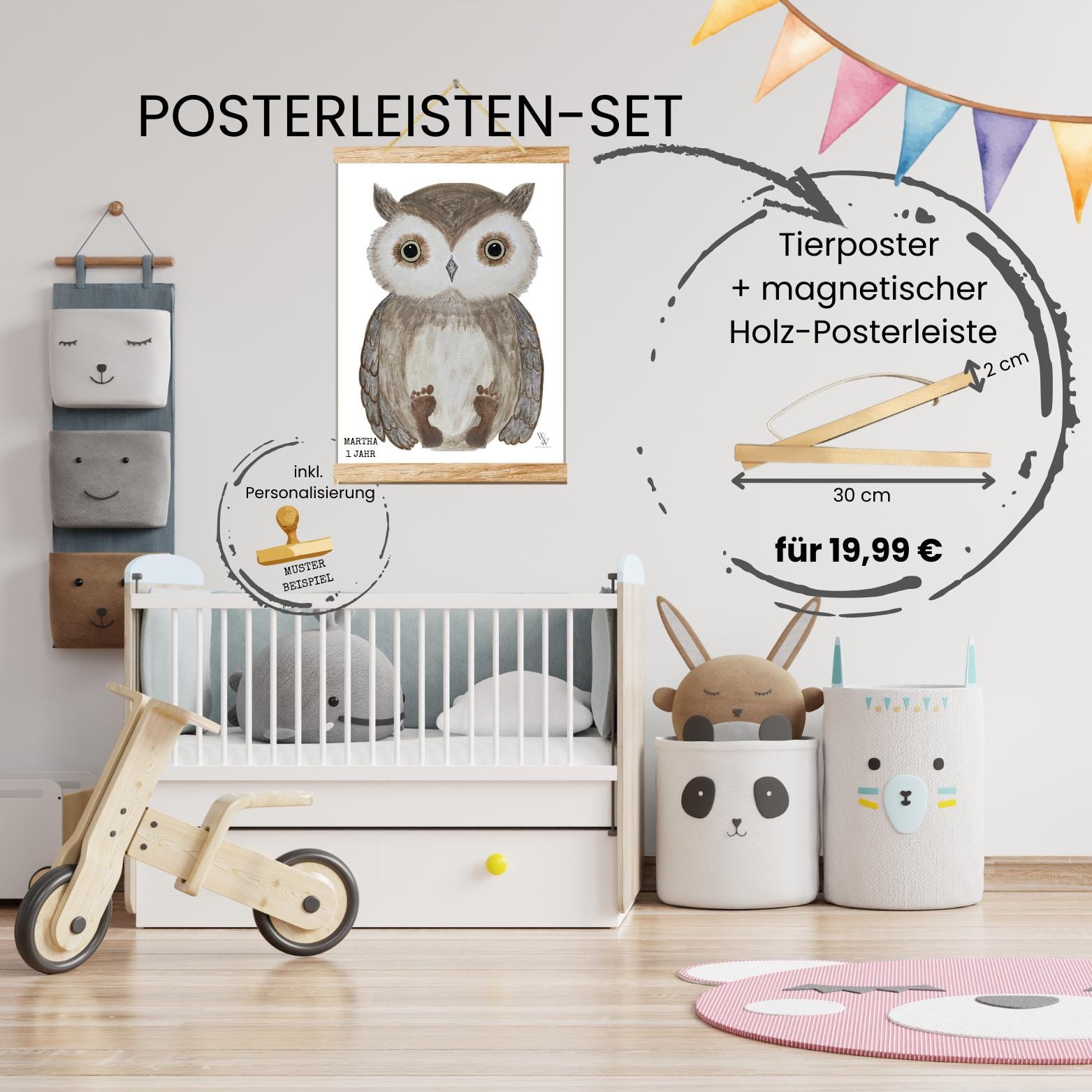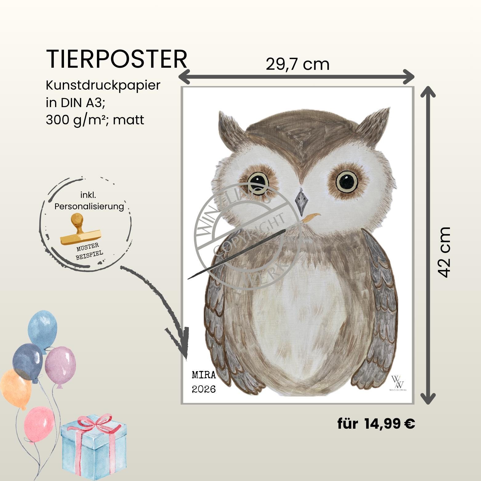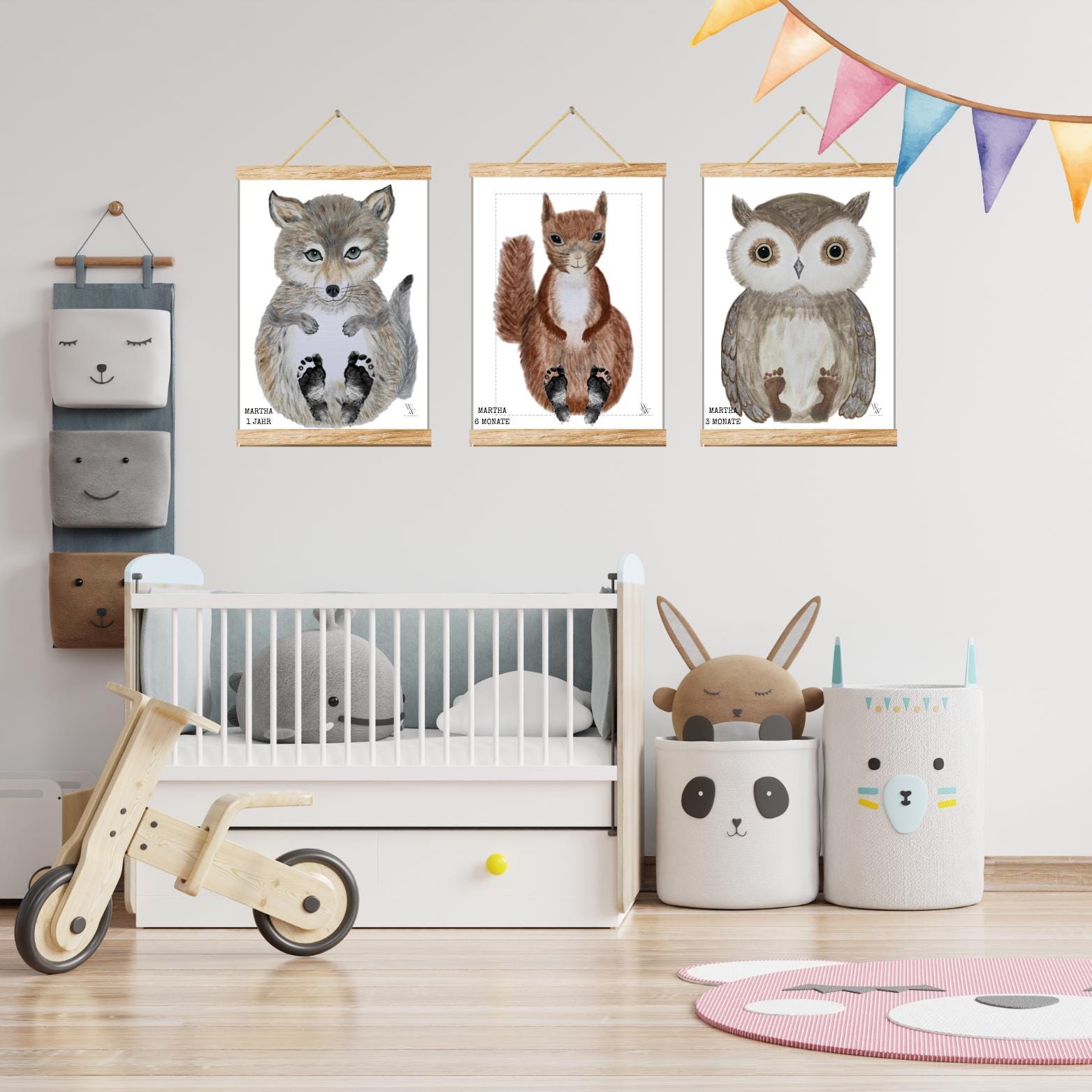 Owl | Hand-painted Animal Baby Poster | Footprint and Handprint Set | Personalized Gift for Birth or Christening | Baby Poster A3 | Clean Touch Pad